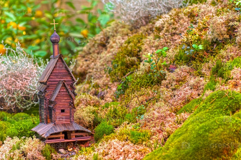 Моделирование сельского пейзажа путем установки деревянной модели сельской рубленой церкви в ланшафте, созданном из разноцветных мхов