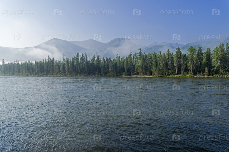 Панорама берега горной реки.Горы частично скрыты поднимающимся утренним туманом. Река Ока Саянская, ущелье Орхо-Бом, Восточный Саян, Бурятия, Сибирь, Россия