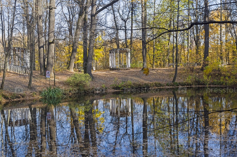 Пруд в осеннем лесопарке. Природный заказник на Воробьевых горах, Москва. Солнечный день в октябре