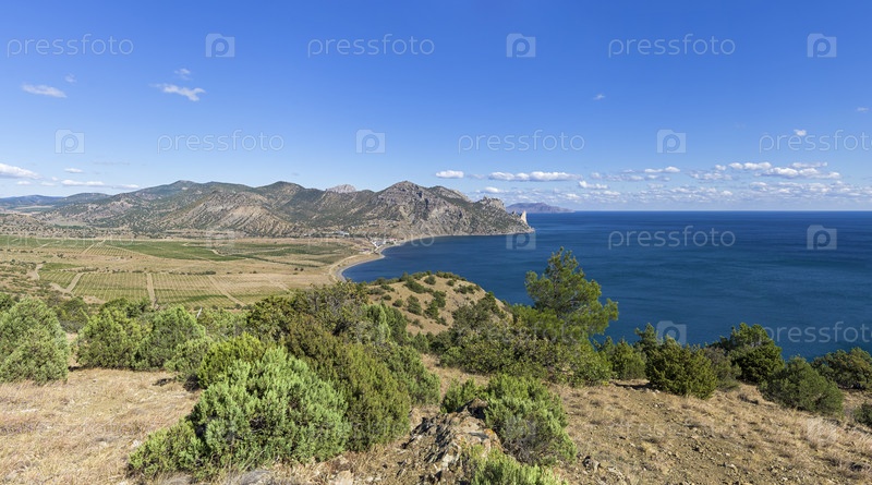 Панорама прибрежной долины и бухты на черноморском побережье Крыма. Окрестности села Веселое. Солнечный день в сентябре