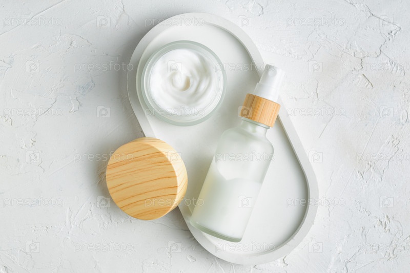 Вид сверху на две бутылки с кремом для лица или тела или лосьоном для ухода за кожей. Натуральные антивозрастные ингредиенты. Безбрендовая упаковка для дизайна