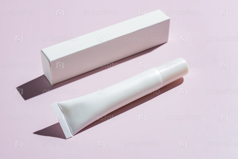 Пустой белый пластиковый пакет для крема для глаз или концентрата для лица рядом с бумажной коробкой на розовом фоне с модными резкими тенями. Небрендовая косметика в упаковке. Макет