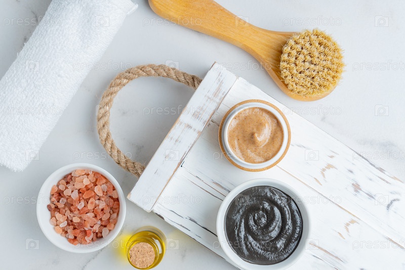 Вид сверху на спа-процедуры дома. Глиняная маска в боэле, скраб для лица, розовая гималайская соль и щеточка для лица с натуральной щетиной. Процедуры по уходу за кожей для расслабления и омоложения,