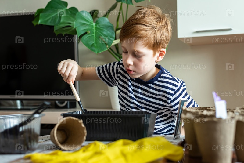 Домашнее садоводство, рыжеволосый мальчик в полосатой футболке сажает сезонные саженцы в экологические горшки. Хобби и повседневная деятельность