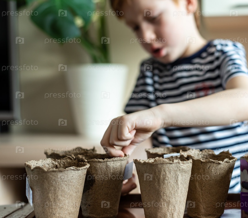 Домашнее садоводство, руки садовника сажают сезонные саженцы в экологические горшки, рыжеволосый мальчик в полосатой футболке. Хобби и повседневная деятельность