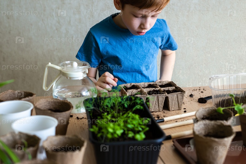 Домашнее садоводство, детские руки садовника, ребенок сажает саженцы и поливает саженцы растений в эко-горшках, крупным планом