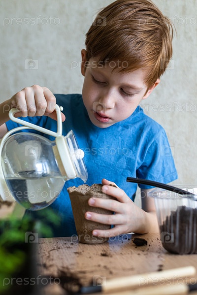Домашнее садоводство, рыжий мальчик-дошкольник поливает саженцы растений в эко-горшках, крупным планом вертикальная фотография