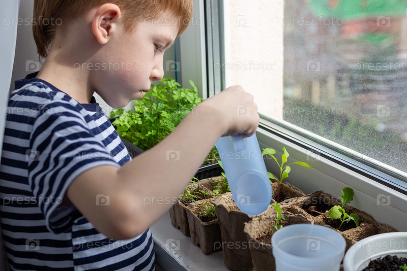 Детский рыжеволосый мальчик поливает растения в горшочках из эко-торфа на подоконнике. Концепция домашнего садоводства, выращивание рассады в весенний сезон, крупный план