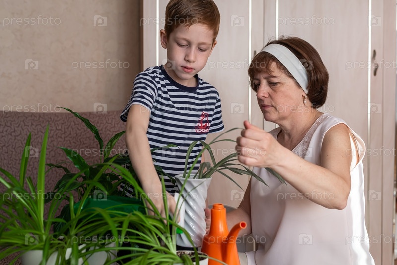 Семья занимается садоводством дома. Концепция весеннего ухода за домашними растениями и цветами. Бабушка и ее маленький внук, рыжий мальчик 6-7 лет, вместе поливают цветы, семейные развлечения