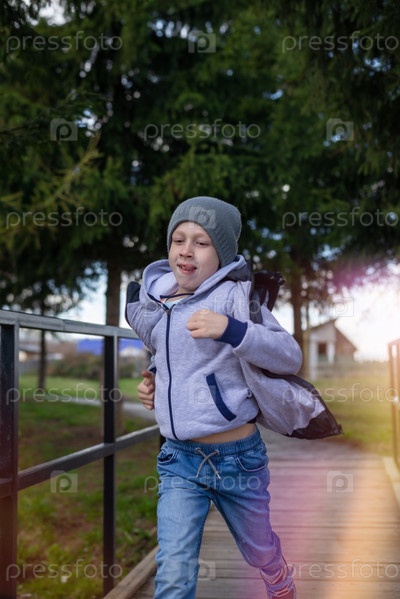 Образ жизни крупным планом портрет рыжеволосого мальчика 6-7 лет бежит по деревянному мосту в парке веселое детство, весенние каникулы