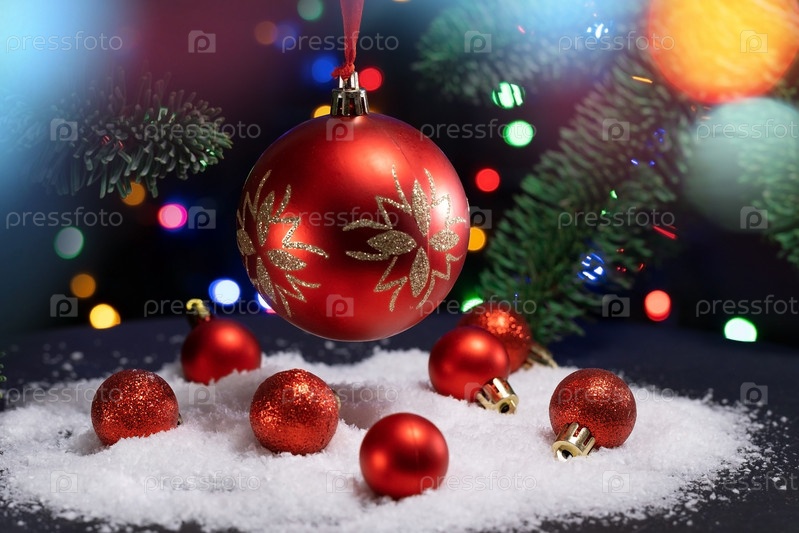 Новый год красный мяч игрушки на фоне боке. Рождественские украшения. Абстрактный размытый фон праздник Боке. Мерцание огней рождественской елки. красная елочная игрушка на снегу