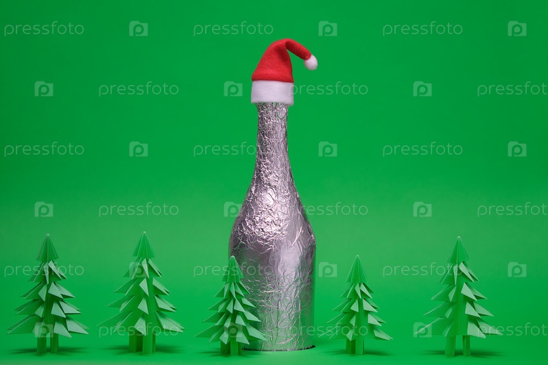 Бутылка шампанского с шляпой Санты и зеленой елкой оригами