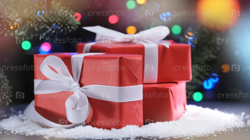 Рождественская красная подарочная коробка, перевязанная белой лентой на снегу, подарок на фоне светящихся гирлянд. Поздравление с рождеством. рождественские каникулы и покупки