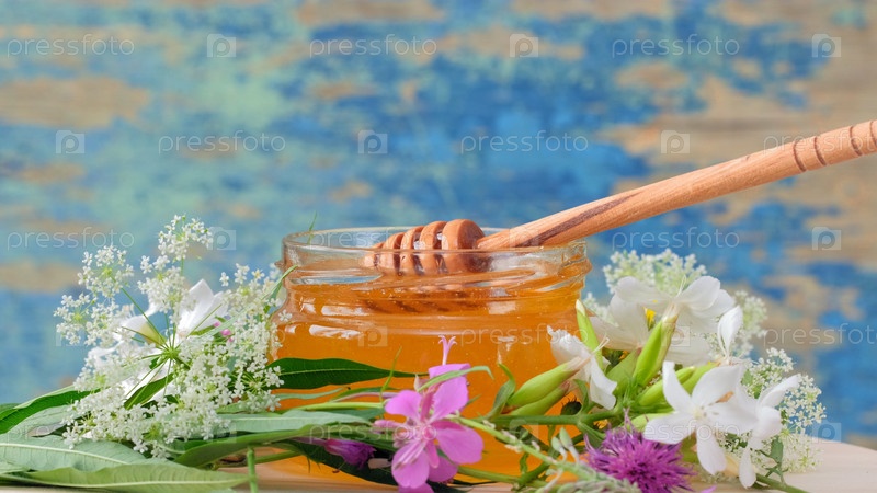 Стеклянная банка со свежим медом на деревенском фоне. Цветы на столе. Мед капает из медового ковша в стеклянную банку. Концепция здорового питания, диета. Медовый фон