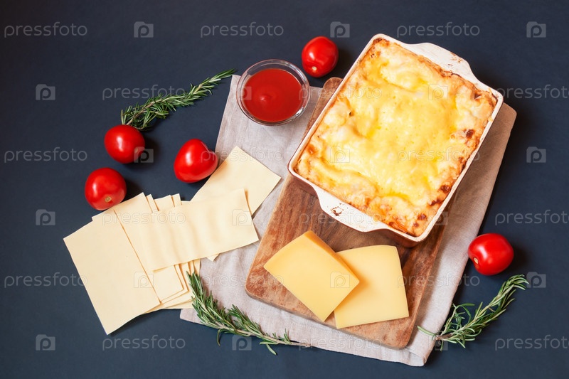 Вкусная лазанья болоньезе в форме для выпечки, сырые ингредиенты и продукты для лазаньи рядом