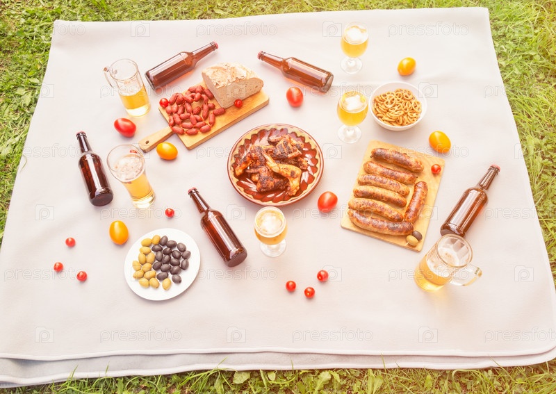 Пикник с жареными куриными крылышками, жареными сосисками, пивными бокалами, кружками и бутылками, хлебом, маленькими колбасками чоризо и оливками