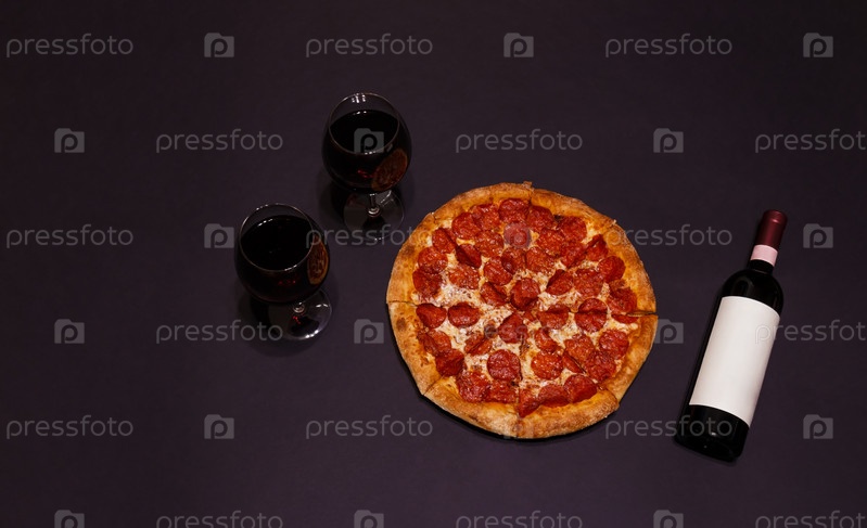 Вкусная пицца пепперони, бутылка красного вина и бокалы красного вина на темном фоне