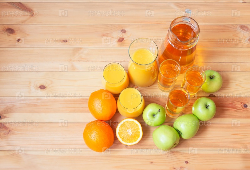 Яблочный сок, апельсиновый сок, апельсины и яблоки рядом на деревянном столе. Вид сверху
