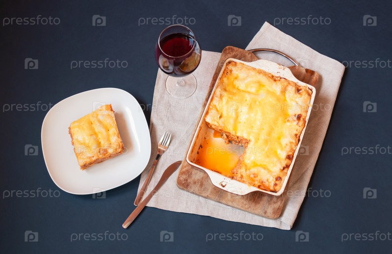 Тарелка с лазаньей болоньезе, форма для выпечки с лазаньей болоньезе и бокал вина. Вид сверху