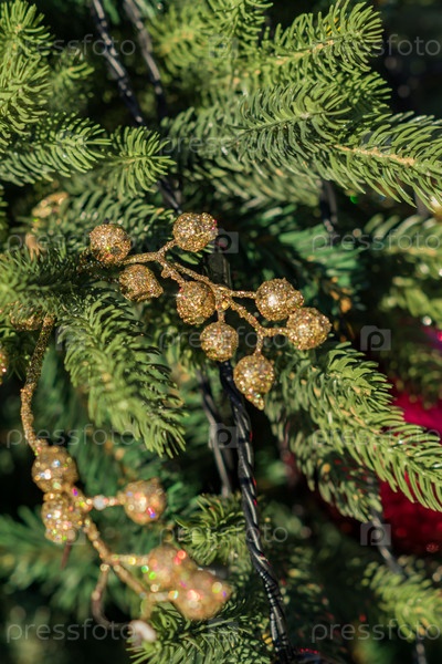 рождественская елка, украшенная золотыми шариками. Новогодний фон