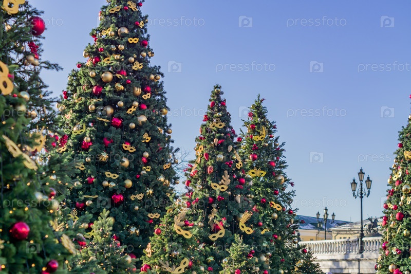 Новогоднее украшение города. Рождественские елки на улице украшены золотыми и красными шарами и гирляндами