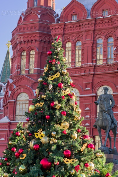 Памятник маршалу Георгию Жукову и елки в Историческом музее на Красной площади в Москве, Россия