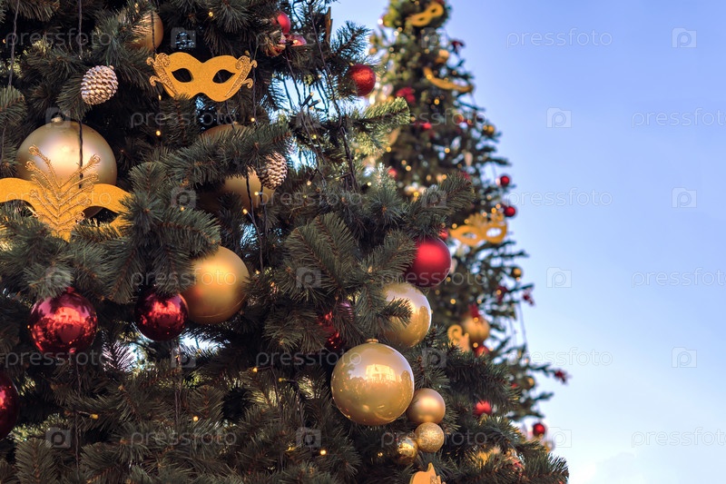 Рождественские и новогодние праздники фон. Рождественская елка украшена шарами и гирляндами на фоне голубого неба, пространство для копирования