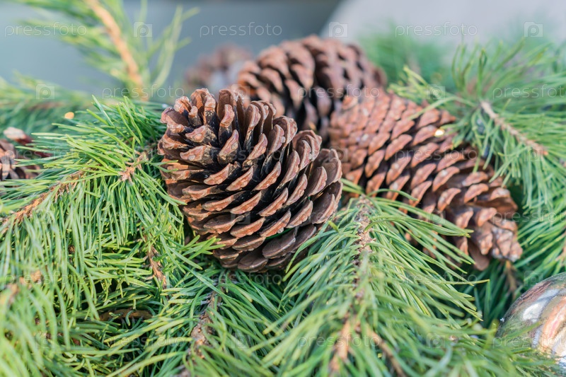Крупный план сосновых шишек на елке