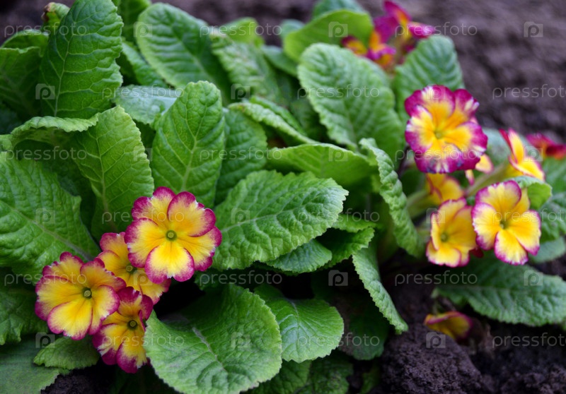 Цветущая примула на клумбе, вид крупным планом