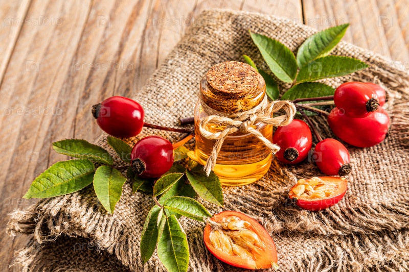 Стеклянная бутылка с пробкой с натуральным маслом семян шиповника на мешковине и деревенский стол среди свежесобранных плодов шиповника. органический продукт