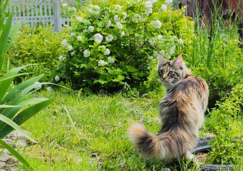 Большой кот Мейн Кун сидит на зеленой траве в саду