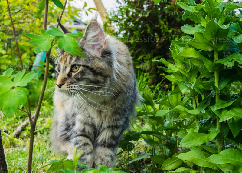 Большой кот Мейн Кун сидит на зеленой траве в саду
