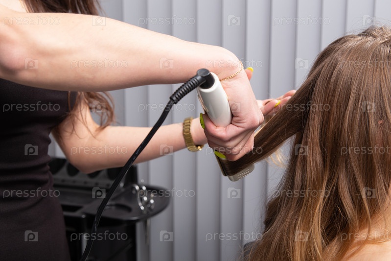 Парикмахер готовит женщину, которая делает прическу с кудрями с помощью щипцов для завивки. Длинные темно-русые натуральные волосы