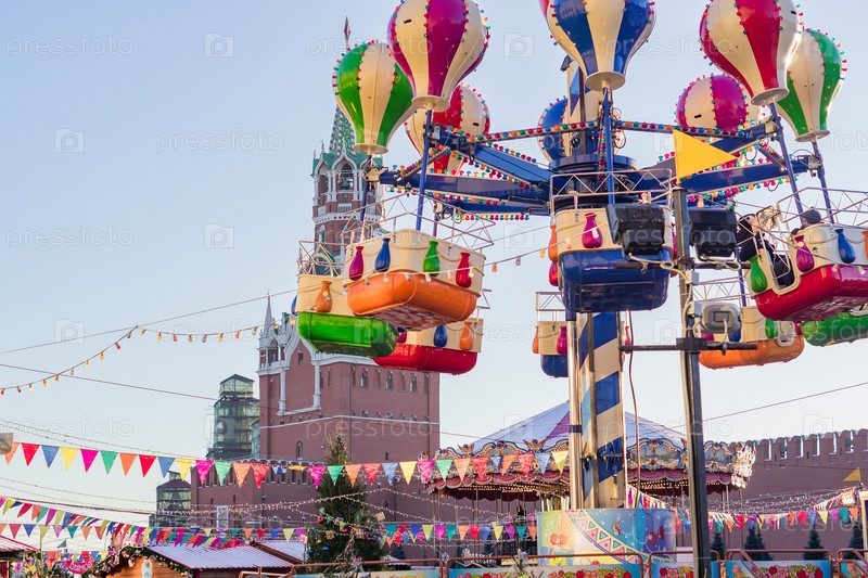 Москва, Россия - 10 января 2018 года: Спасская башня Кремля и карусель на Красной площади
