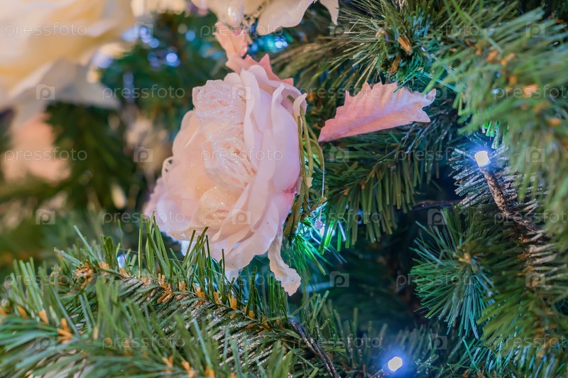 Закройте рождественскую елку, украшенную нежным розовым цветком