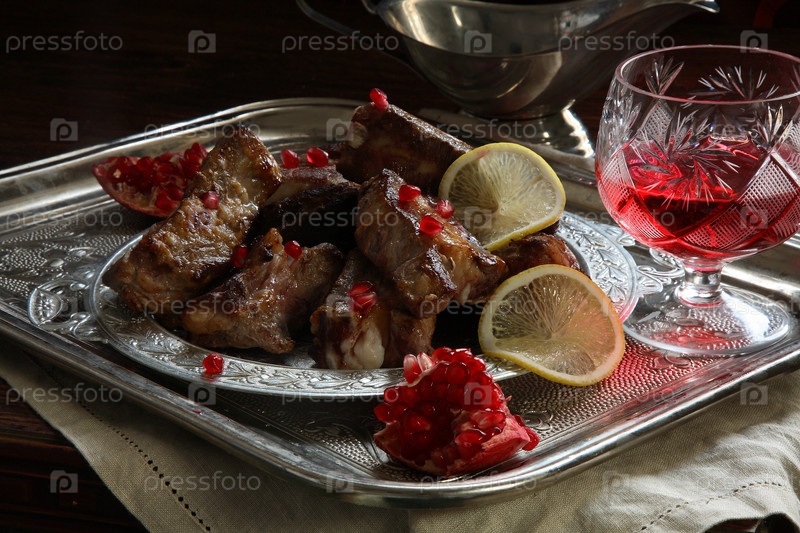 Свиные ребрышки с гранатом и красным вином с дольками лимона