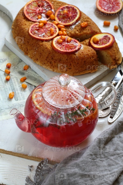 Апельсиновый пирог с фруктовым чаем на деревенском фоне
