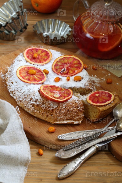 Апельсиновый пирог с фруктовым чаем на деревенском фоне