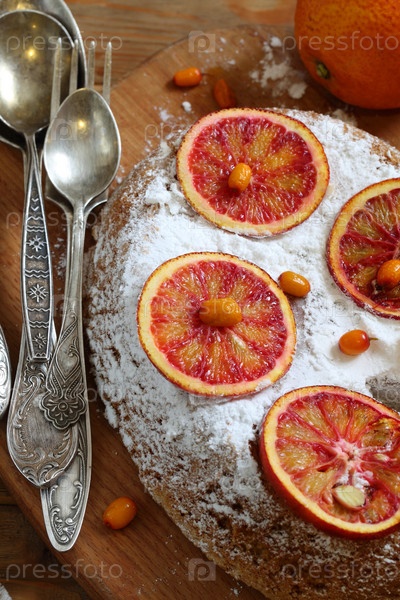 Апельсиновый пирог с фруктовым чаем на деревенском фоне