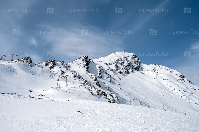 Горный массив, крутые склоны и заснеженные скалистые вершины с опорами для канатной дороги