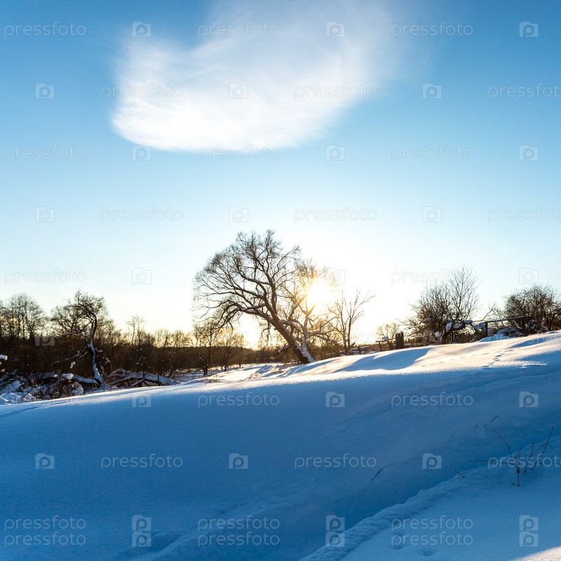 Пушистый белый снег на дереве в лучах заката. Зимний морозный вечер