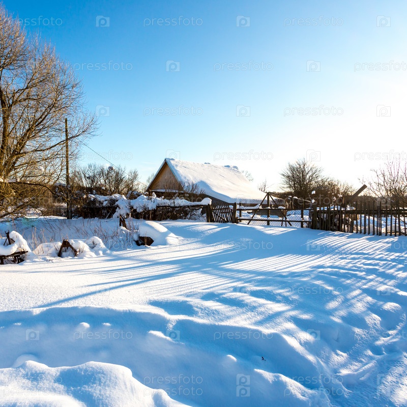 Раннее зимнее утро. Традиционная русская деревня в снежную морозную зиму