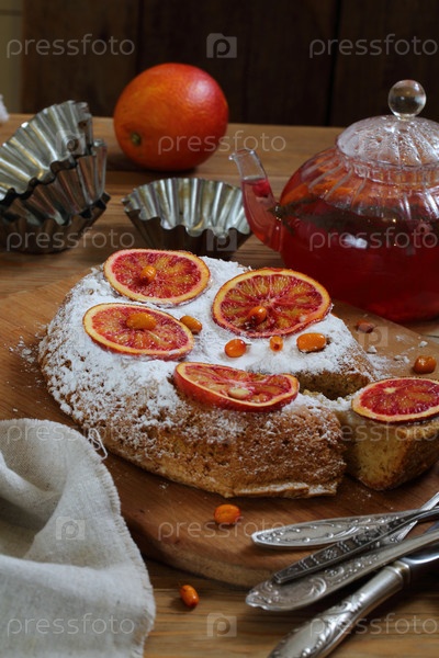 Апельсиновый пирог с фруктовым чаем на деревенском фоне