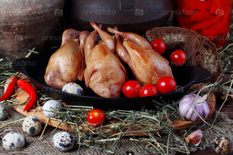 Копченый перепел на деревянном фоне с помидорами и яйцами