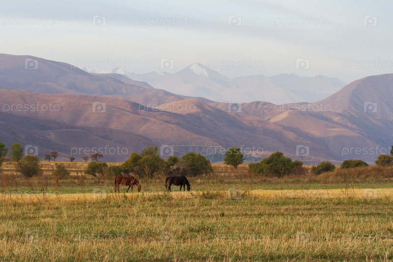 Лошади на пастбище на фоне гор, Кыргызстан