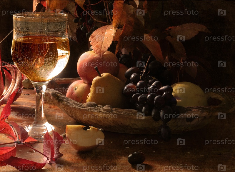 Натюрморт с бокалом вина на деревянном фоне