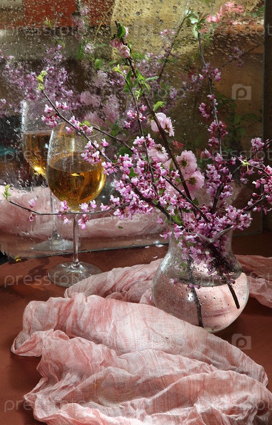 Натюрморт с бокалом вина и букетом цветов