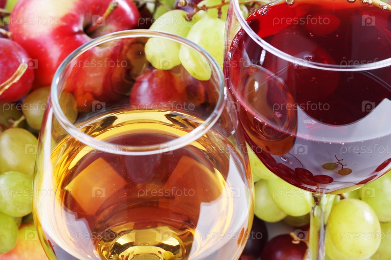 Бокал красного и белого вина с фруктами на белом фоне