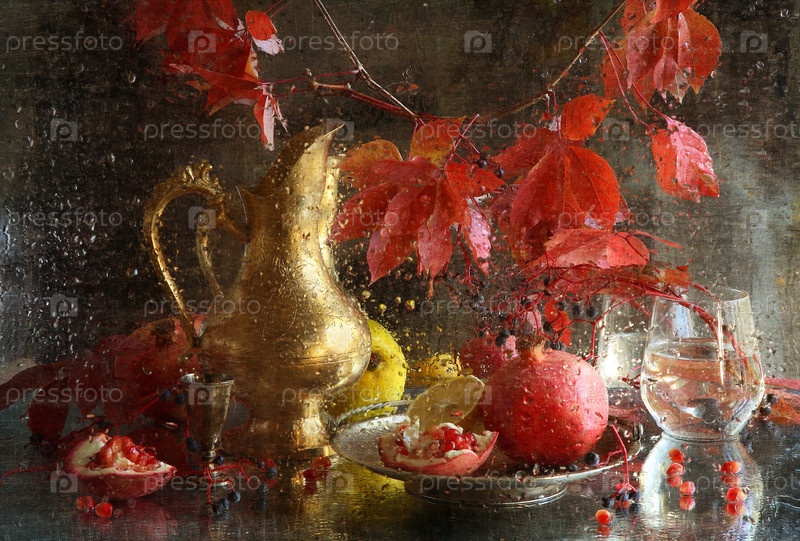 Натюрморт с медным кувшином, айвой и гранатом за мокрым стеклом