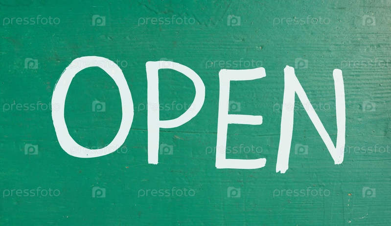 Написанная от руки бирка с открытой вывеской на витрине магазина, белая краска на зеленом дереве